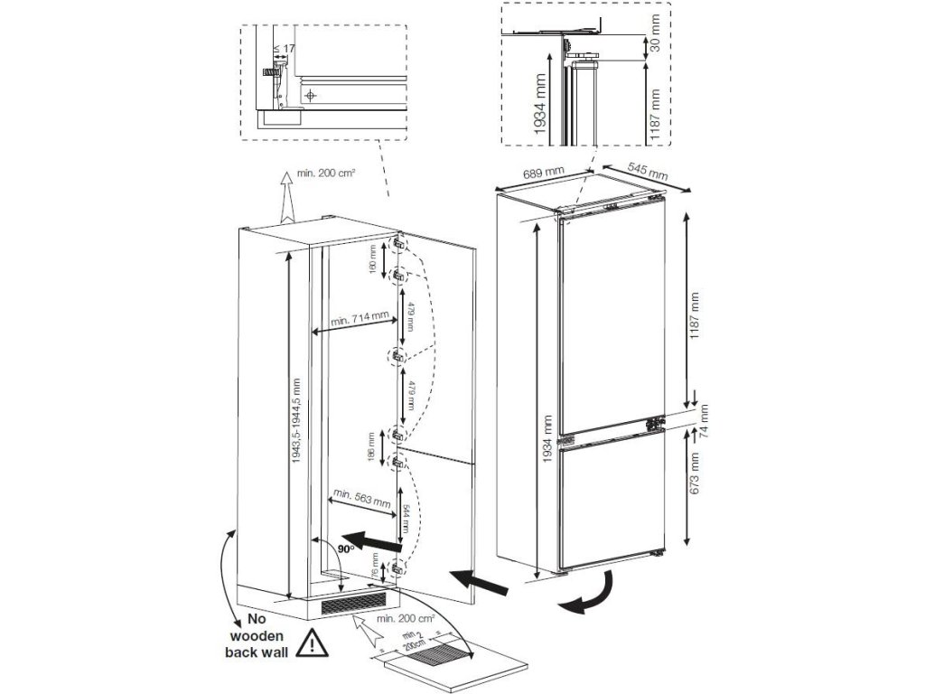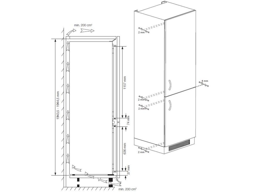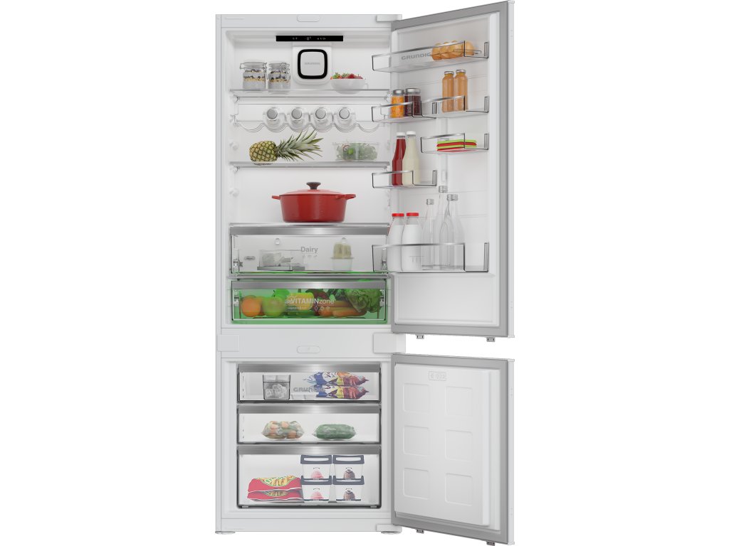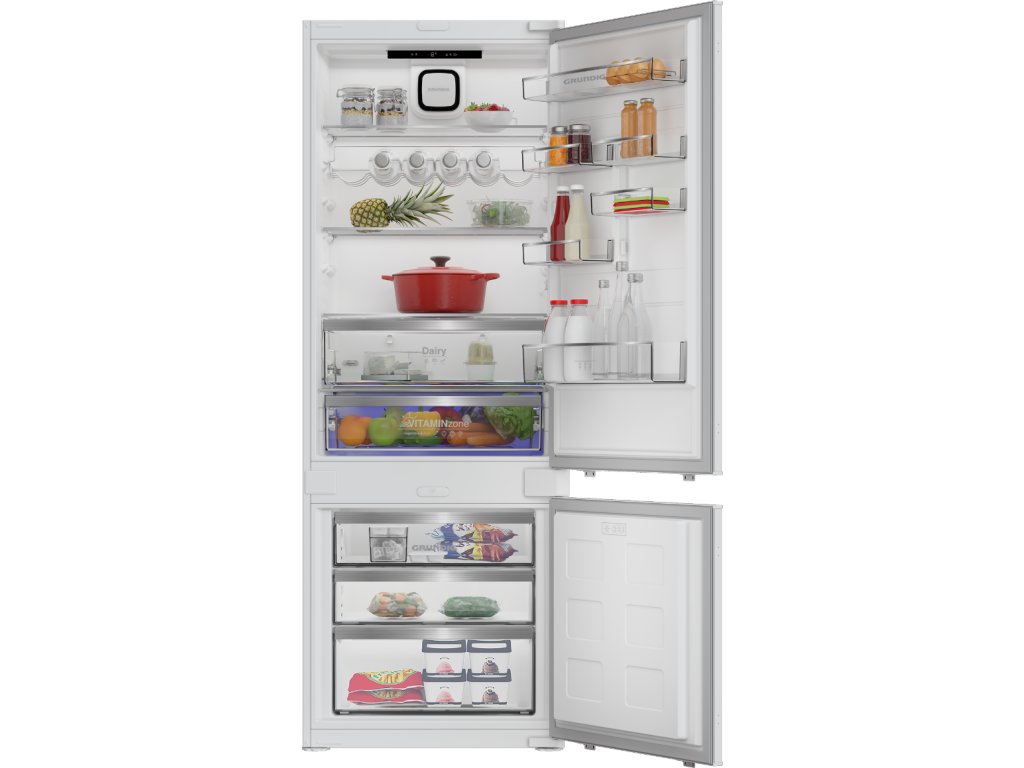 Vestavná kombinovaná chladnička; Nulová zóna; en. třída D; celkový hrubý objem 370 l; možnost změny směru otevírání dveříl; kluzné panty pro vestavbu do kuchyňské linky; Přihrádka VitamineZone se střídáním světla pro uchování vitamínů a čerstvosti; AeroFresh rychlejší chlazení, lepší distribuce chlazení, méně úniků teploty; režim Eco, Dovolená, FastFreeze; spotřeba el. energie: 198 kWh/rok; hlučnost pouze 35 dB; rozměry (V x Š x H): 194,5 x 69 x 55 cm.