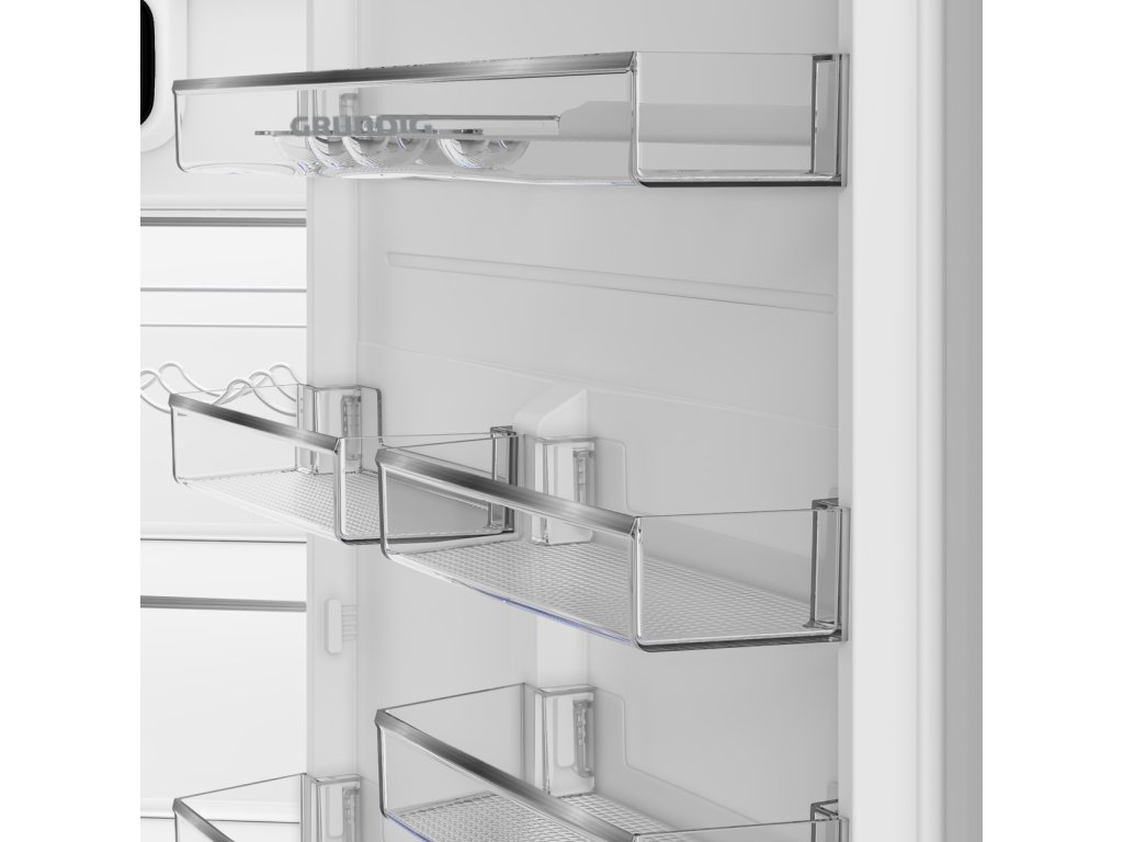 Chladící část: objem 280 l; vnitřní LED osvětlení; 1 pevná + 3 nastavitelné police z bezpečnostního skla; VitaminZone - zásuvka na ovoce a zeleninu; kovový držák lahví; 2 standardní a 4 půlené závěsné přihrádky ve dveřích; držák na vajíčka