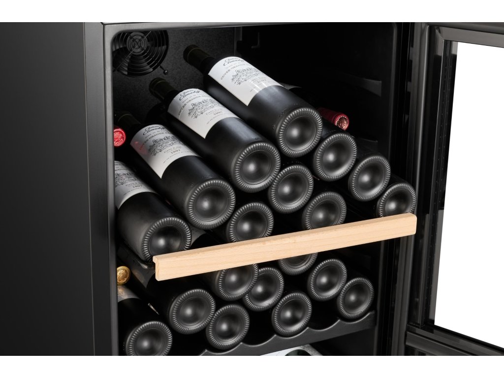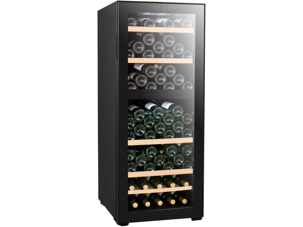 Volně stojící dvouzónová servírovací vinotéka se 2 nezávislými chladícími zónami; Celková kapacita 108 lahví o objemu 75 cl (horní zóna 49 lahví, spodní zóna 59 lahví); Rozsah nastavení teplot: 5~20 °C pro horní zónu a 5~20 °C pro spodní zónu; Skleněné dveře s černým rámem a zapuštěným madlem; 2 vrstvy tvrzeného skla s černým tónováním a UV filtrem; Černé tělo vinotéky; Elektronická regulace teploty; Dotykové ovládání s LED displejem v bílé barvě; Bílé LED osvětlení s vypínačem; Automatické odmrazování; Systém aktivní ventilace v obou zónách; Antivibrační systém; Zvukový a vizuální signál zvýšení teploty; 5 výsuvných drátěných polic s dřevěným čelem; 4 výškově nastavitelné nožičky; Délka napájecího kabelu 200 cm; Energetická třída G; Klimatická třída N; Roční spotřeba energie: 153 kWh; Hlučnost 38 dB(A); Hmotnost 48 kg; Rozměry (VxŠxH): 121,6 x 49,5 x 59,6 cm.